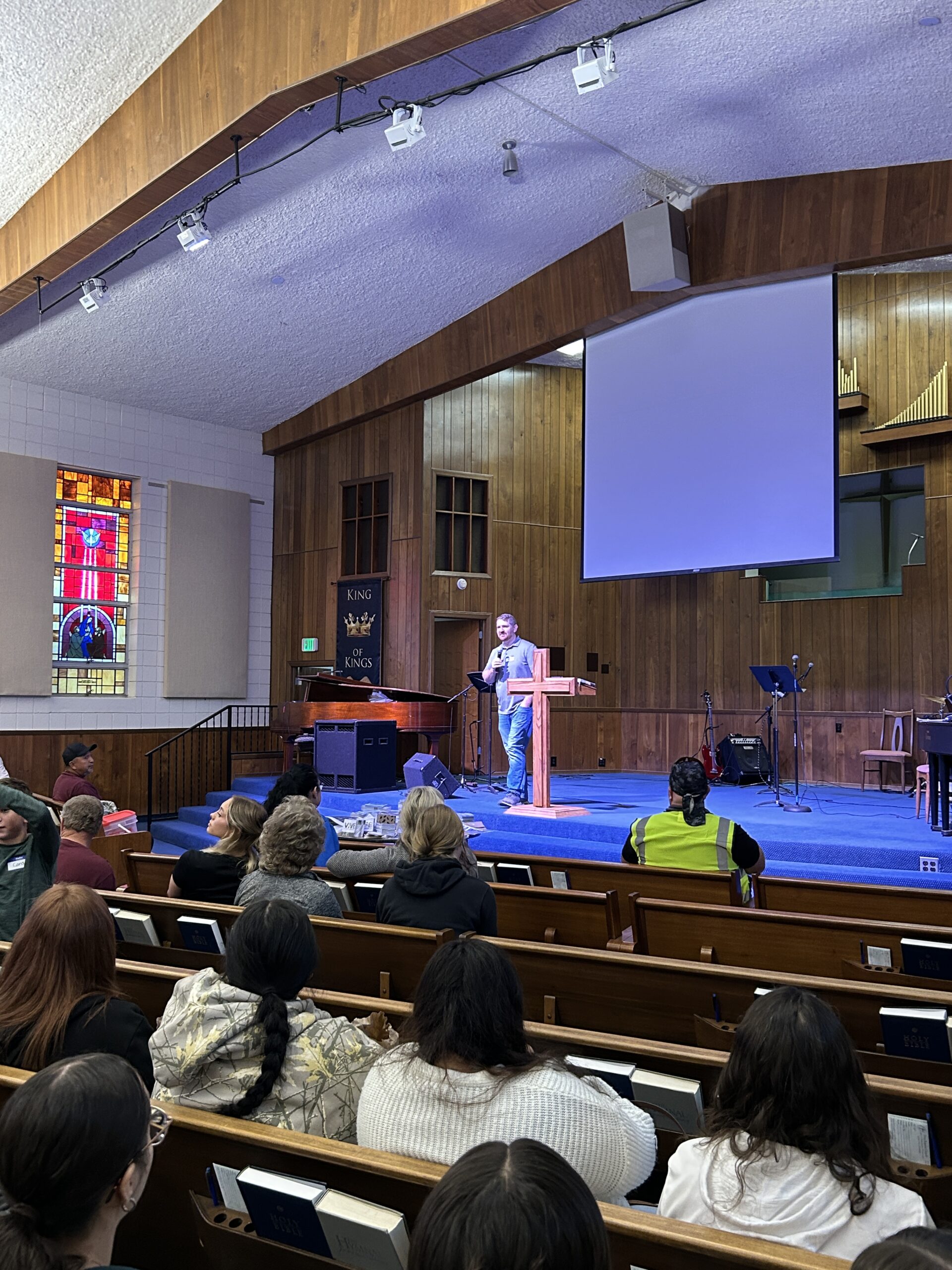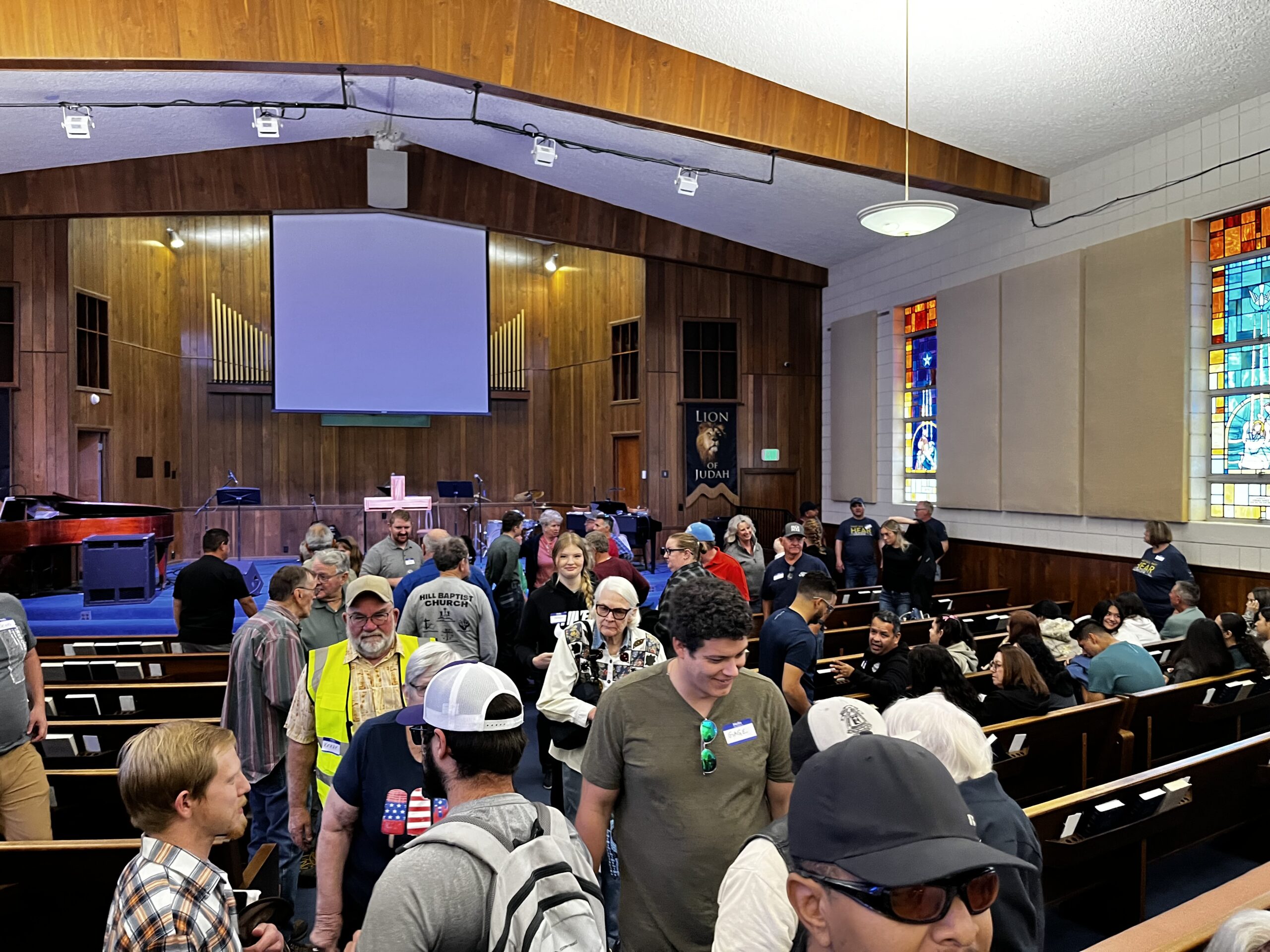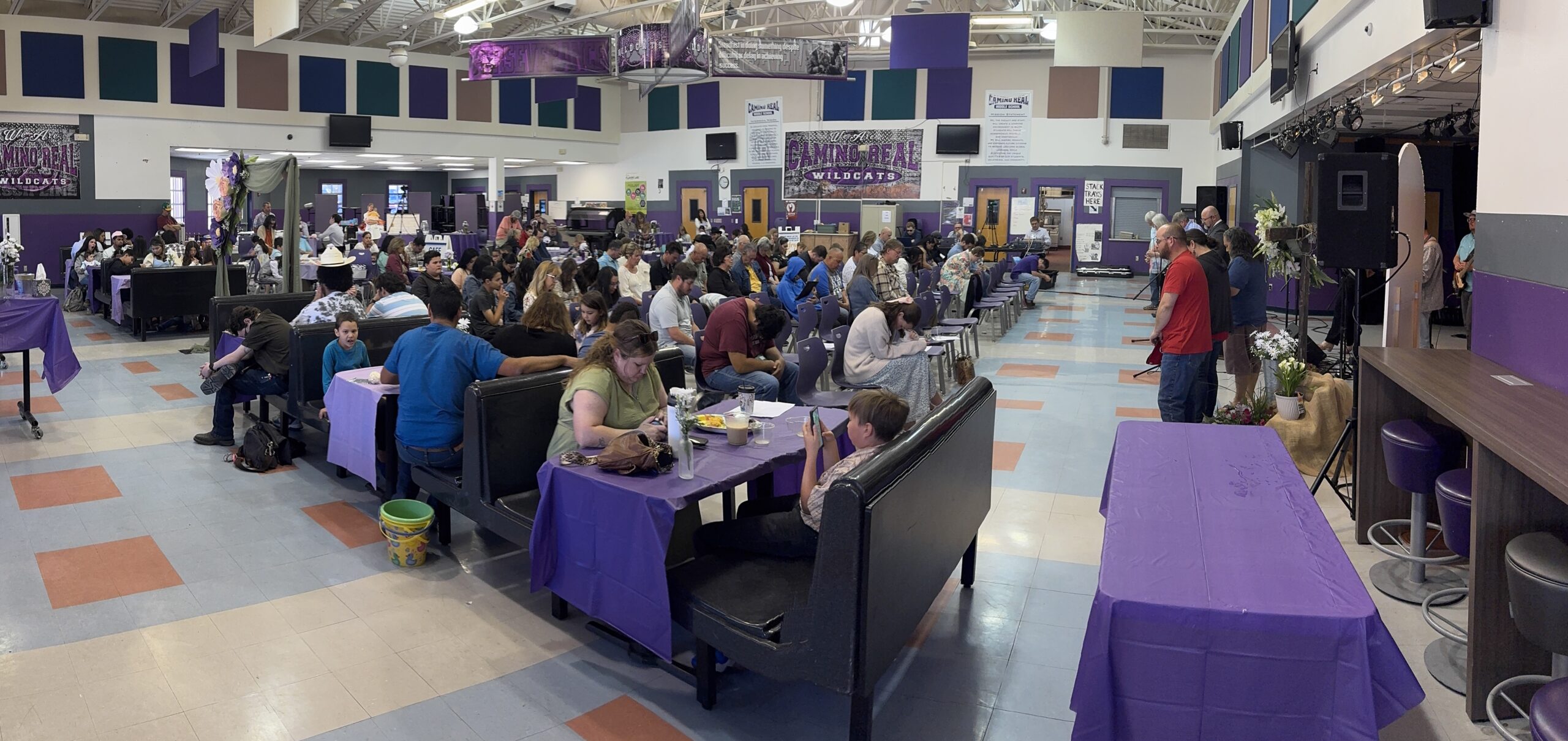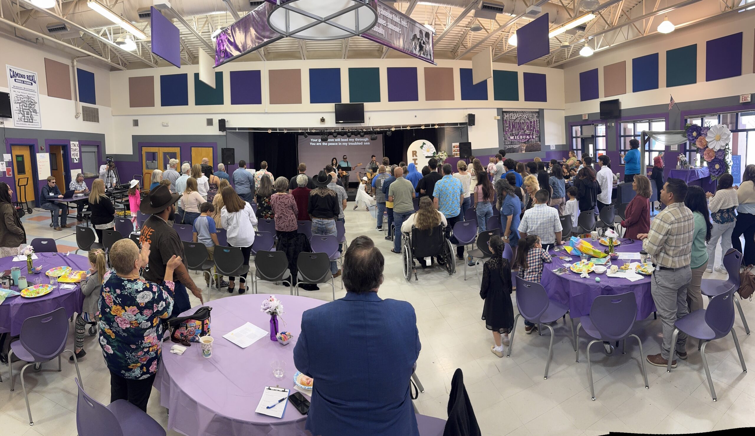 A cafeteria/sanctuary transformed for worship.