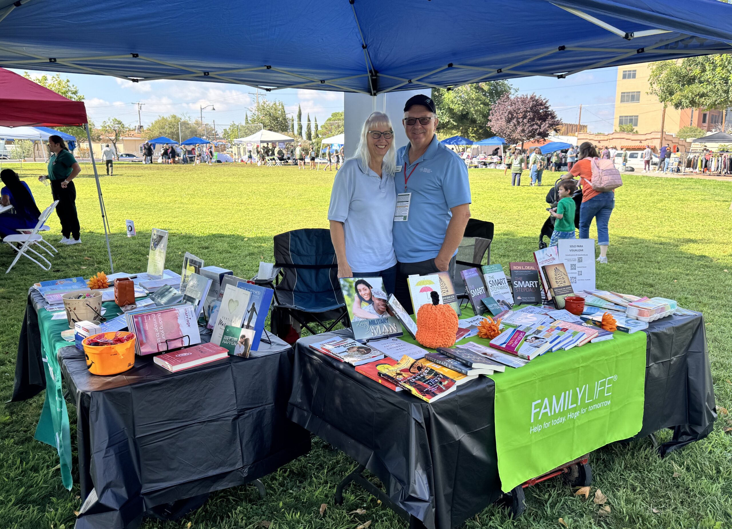 In partnership with FamilyLife, a ministry of Cru), Thrive City is trying to be visible in creative ways in and around Las Cruces and southern NM. Here are Tim & Sheila Steele (NM FL’s Ministry Reps and TCC members) hosting a Marriage & Family” resource booth at a local community outreach.